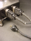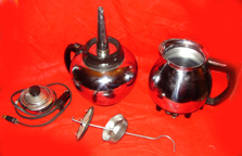 This is a very lovely "LaBelle" coffee service. The photos were sent by our reader "Pru." This would have been a wedding or anniversary present. Unfortunately, it is a percolator and it does not make very good coffee. ![]() Electrical connections for the Percolator I don't know anything about this mark other than the fact that it was made in Brooklyn. Click here to look at another type of collectible, or keep on scrolling for more Coffee devices. | |||||||