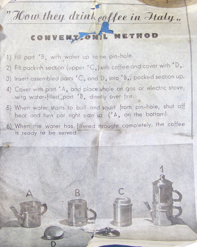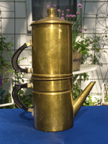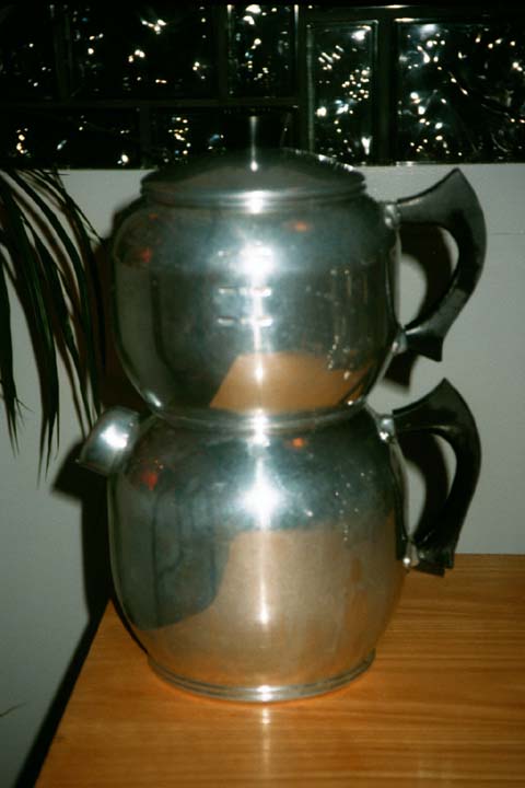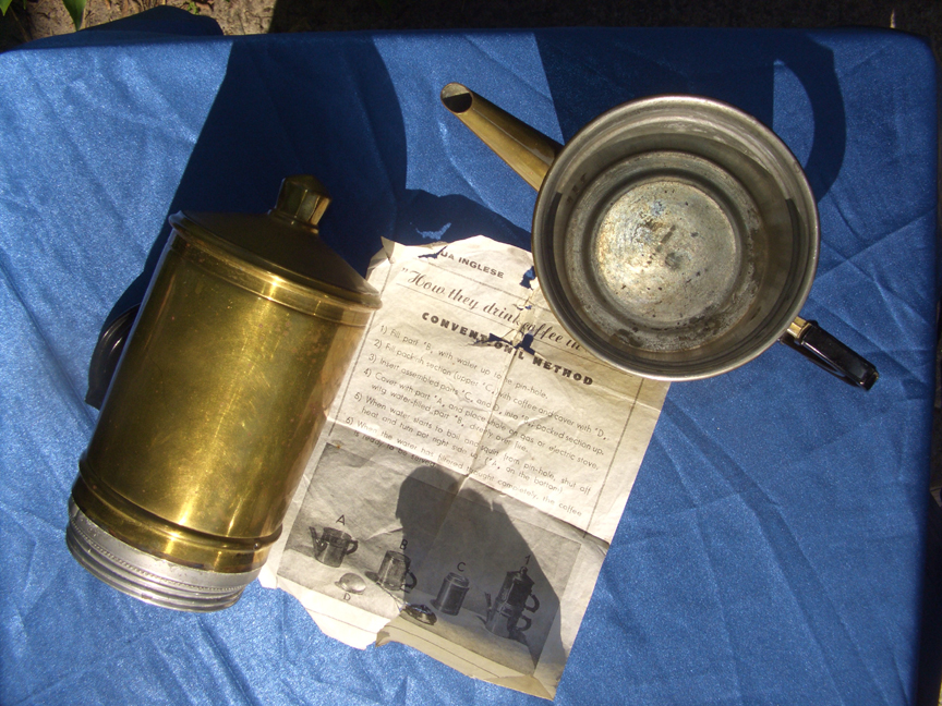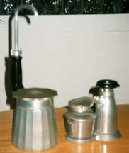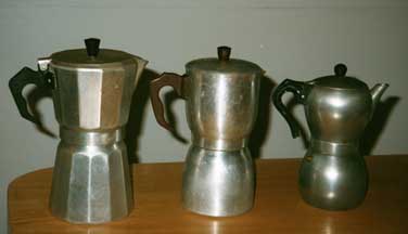 Here are three lovely Vesuvio style Espresso makers (6, 4, and 2 cup models). These things are widely available and can approximate a good cup of Espresso --- provided that you watch it very carefully, use distilled water and have very finely ground coffe. Tap water is death to these things because the minerals in it greally clog up the pressure valve. These things have to be kept scrupulously clean! Click here to look at another type of collectible, or keep on scrolling for more Coffee devices. | |||||||