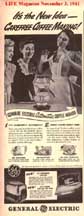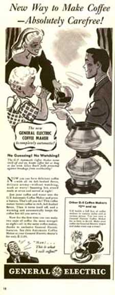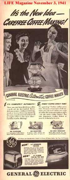 Ads for the GE Model 129P8 GE Coffee-Maker Ads (left) From LIFE Nov 3, 1941 (right) From LIFE Oct 6, 1941 Click to Enlarge Check out our Toaster Page for a discussion of the Toaster in the Ad Click here to look at another type of collectible, or keep on scrolling for more Coffee devices. | |||||||