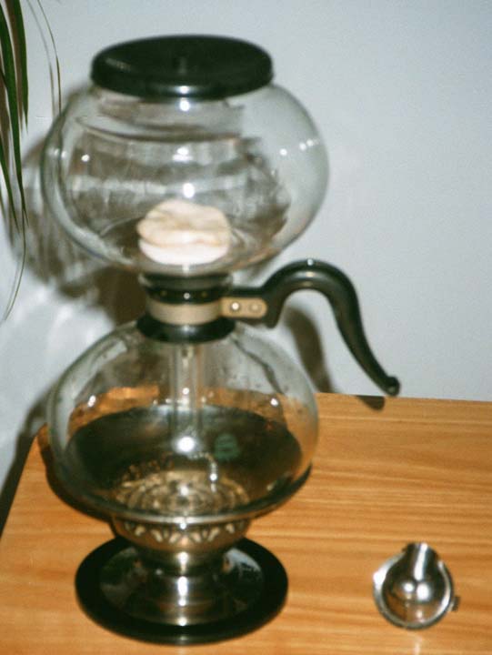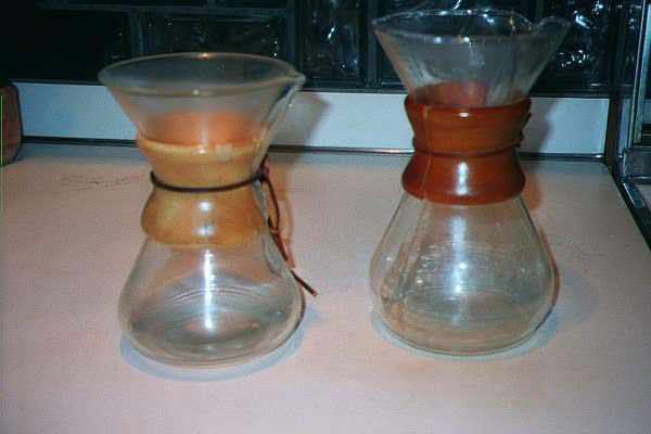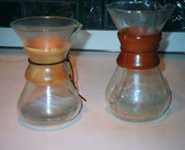 The Chemex is a beautiful object --- a hand-blown double cone of glass that serves as both coffee brewer and server. The upper cone holds a filter; ground coffee is placed in the filter and hot water poured therein. The brewed coffee drips down into the lower cone. The filter is removed and the device may be used to serve the coffee. Because the glass gets very hot, there is a wood grip, made of two curved pieces held together with a leather thong. A wooden ball/toggle is used to cinch the pieces together, but it can be loosened to remove the grips so that the device may be cleaned. The Chemex has touched my life in several ways... Before my family moved to the Suburbs, my dad would only drink espresso and it had to be made very precisely --- every day, on the way home from work, he walked by the Nicholas Coffee warehouse and came home with a small bagful of fresh roasted beans. After dinner, he would grind these with a hand mill and make espresso on a Vesuvio stove-top apparatus. Although we were dirt poor, we enjoyed very good coffee. When we moved to the Suburbs --- the most singularly traumatic event in my life --- coffee began to come from cans. (Fortunately, we did not move far enough into the Suburbs for coffee to come from jars....) In 1956 or 1957, we received a package from California sent by Uncle Tony. (Those of you who read the website regularly know that Uncle Tony was a professional musician, zoot suiter, and general black sheep of the family). Inside this package was a Chemex coffee maker, much like the ones pictured above. Anything from Uncle Tony was suspect, and more so since it came from California ("The Land of Fruits and Nuts" as my Dad was fond of saying) In suburban Pittsburgh, this glass object with the strangely primitive wood grip held by a leather thong was truly exotic. Mom placed it over the refrigerator and it served as a conversation piece for a few months. ("What's that?") After that, the Chemex was sentenced six years in the back of a cupboard for being inscrutable to suburban housewives. Then, I visited the Museum of Modern Art in New York which has a small exhibit of the great design innovations of the 20th Century --- among them is a Chemex coffee maker, a dead ringer for the one above our stove. When I got home, I was able to rescue the Chemex and take it back with me to College --- a Museum Piece. I treasured this object, my very tenacious link with the fashionable people who frequented the Museum of Modern Art. When it was learned that President Kennedy fancied Ian Fleming, I immediately acquired a copy of From Russia With Love. Like all young men of the period, I eagerly memorized James Bond's favorite consumer products. To the vast unwashed generations of poor kids catapulted into the confusing social whirlpool of College, James Bond was a sort of mentor, someone who could guide you to making the Correct Choice of razors (Hoffritz), toothpaste (Vademecum) and Coffee Makers. To wit, I present a quote from vintage Fleming, as Bond describes his "normal" breakfast: "...two large cups of black coffee from De Bry's in New Oxford Street, brewed in an American Chemex (and no sugar). A single egg, boiled for three and a third minutes. Thick slices of wholemeal toast, with Jersey butter; Tiptree 'Little Scarlet' strawberry jam, Cooper's Vintage Oxford marmalade, and Norwegian Heather Honey from Fortnums...." You can buy any of these items except coffee from de Bry's -- the store closed in the 1980s and the building is now a computer store. Some calls to friends in London revealed that Jamaican Mountain Blue coffee is a good substitute for De Bry's celebrated brand which also came from Jamaica. In the books, Bond ---the force for Good --- had a preference for the handmade and the personal. The villains had a predilection towards Technology. One could imagine either Bloefield or Dr. No showing off his "Mr. Coffee" device. In all candor, and at the risk of sounding bourgeois, the Chemex just does not work very well... I know that this borders on Heresy, but the filter is not well supported in the blown glass funnel. Even if you use the VERY EXPENSIVE specially reinforced Chemex filters, the paper often breaks and you have a pot full of grounds. The Melita system seems to work a lot better for the practical necessities of making lots of coffee. Of course, James Bond left these details to his minions... Dr. Peter Schlumbohm, Inventor of the Chemex