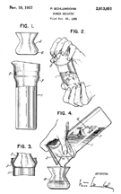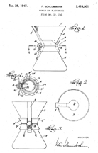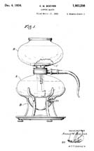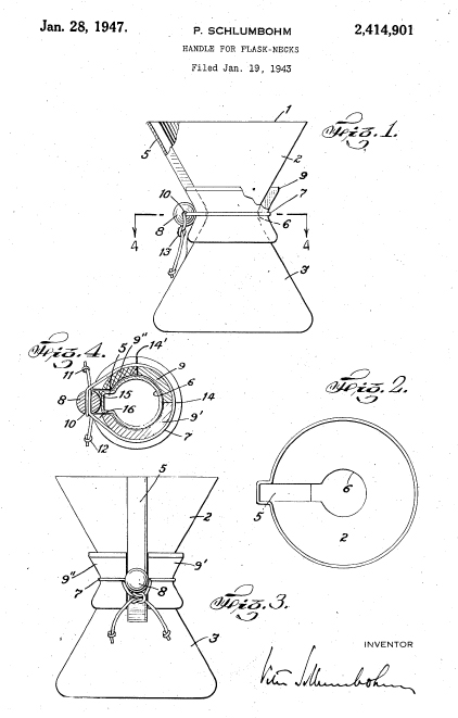 The Chemex Patent and Some of Dr. Schlumbohm's Other Inventions Chemex Coffeee Brewer Patent No. 2,414,901 -- DRIP METHOD Champagne Cooler Patent No. 2,163,568 Cocktail Shaker Patent No. 2,813,651 Click to Enlarge The Chemex Coffeee Maker was invented by Dr. Peter Schlumbohm who was a real chemist who has an interesting life story, as told in Gourmet Magazine. We have reproduced (above) the patent diagrams from some of Dr. Schlumbom's other inventions as discussed in the Gourmet Magazine story. Click here to look at another type of collectible, or keep on scrolling for more Coffee devices. | |||||||