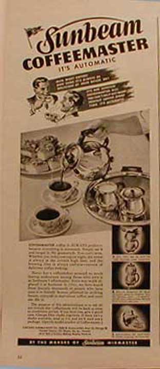 This is a classic Sunbeam vacuum coffee maker, made famous in advertisements in Life magazine during the late 1940s. This is an automatic coffee maker --- you load it up and it takes care of brewing the coffee. A light comes on when you are ready to serve. This is a significant step in the evolution of coffee makers, so we have devoted considerable attention to it -- including lots of patent diagrams in our special page on Coffee Technology Here are the directions for using the Sunbeam C30 Coffee Maker Directions for Using the Sunbeam C30-A Coffee Maker Click to Enlarge The Sunbeam came with an attractive tray set. While returning from the Reading Air Show, we stopped at a roaside flea market, and what should appear (for a quarter) but the tray!! ![]() Here is the Manuufacturer's information: US PAT 1994323,2345262,2345264,2345265 Canada Pat 1939-42-44 Model C30A CSA Approval No 8402 110-120 V 100W Here is a nice grouping of ads for the C30 and related products from Sunbeam