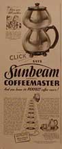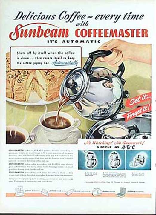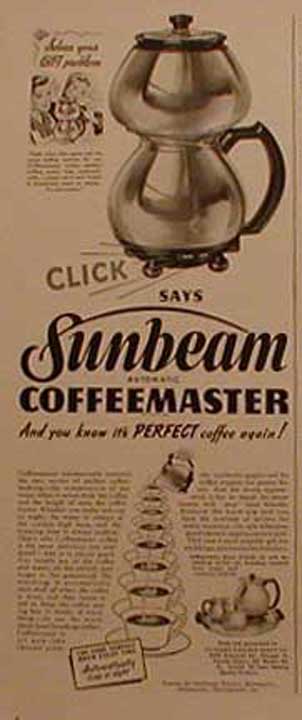 Ads for the Sunbeam C30 Coffeemaster (left) LIFE Nov 3, 1941 (middle) LIFE Oct 6, 1941 (right) LIFE Nov 12, 1947 Click to Enlarge Check out our Toaster Page for a discussion of the Sunbeam T-9 Toaster in the Ad Problems with the C30A Seal This is a high quality, well-made product. The principal design flaw resulted because Sunbeam did not expect that the product would have such a long life. The seal between the server (bottom part) and the reaction chamber (top part) is made of rubber. Over time, this changes composition and hardens. If the reaction chamber is in the Server, then you cannot get them apart. If the two parts are separated, the gasket will not compress and you cannot put them back together.