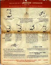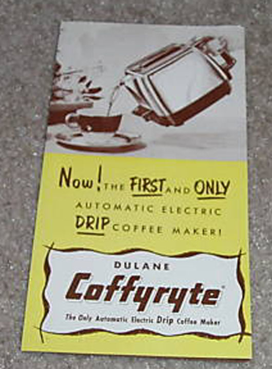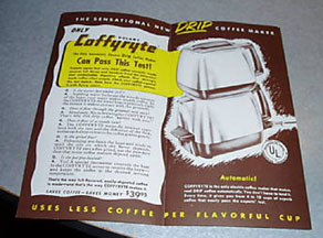 The folks who invented the Fryryte deep fat fryer also invented a marvelous automatic drip coffeemaker -- probably the precursor to the "Mr. Coffee" machines. They called their creation the "Coffyryte" -- it was absolutely gorgeous but it didn't sell, possibly because of its square shape. I have been looking for one for years, but they never seem to come to market. Above are some photos of an advertising flyer for the Coffyryte: Click here to look at another type of collectible, or keep on scrolling for more Coffee devices. | |||||||
