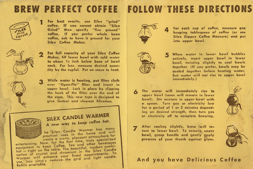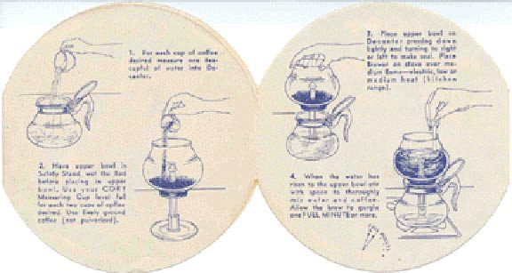 The Silex 4 Cup Coffee Maker Label for the Stove VACUUM METHOD NOT Automatic Click to Enlarge I am extremely fortunate to have all three of these beautiful objects! Here are representative directions for using the Silex coffee makers ![]() ![]() Directions for using a Silex Vacuum Coffee Maker Click here to look at another type of collectible, or keep on scrolling for more Coffee devices. | |||||||