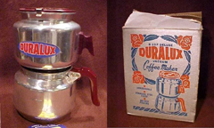 We are indebted to our reader David from the History department at Wooster College for theis analysis of the Duralux Coffee Maker. "... here is a coffeemaker from the early 1950s called Duralux, made in Wooster, Ohio by the Buckeye Aluminum Company. It incorporated a unique filter), and it was patented by a local inventor and businessman who worked for the company, Mr. Joseph E. Fishelson, who later was president of Akron Brass and Red Head Brass. Attached is the patent and a photo of the coffeemaker. It had a nice design and was basically a stove-top model, though it could be matched with a hot plate/burner (like a Cory or a Silex burner), since it was aluminum. ..."