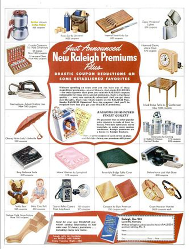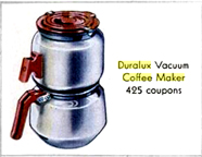 ![]() Duralux Coffee maker Patent Number D-153,342 The DuraLux Coffee Maker appeared in this advertisement for Raleigh Cigarettes. In the 1940s, tobacco companies provided coupons with each pack ( and bonus coupons for cartons). In turn, these coupons could be redeemed for valuable merchandise. In this ad, the DuraLux could be had for smoking 425 packages (approximately 8,500 cigarettes). A one-pack a day habit could get you this beautiful coffemaker in about 14 months... if you didn't die of cancer first...