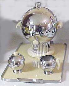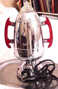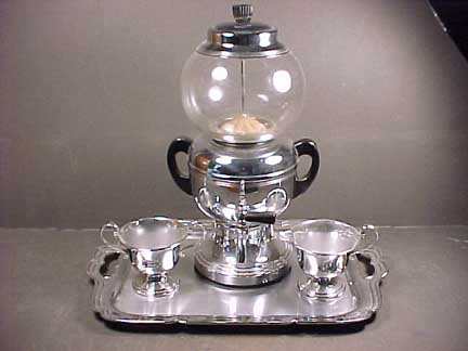 Mannning-Bowman was the Cadillac of giftware! Their slogan was "M-B Means Best". This is the "Harmony" coffee service, which appeared at least a year before Chase introduced the "Coronet" service. The 1937 Manning-Bowman catalogue notes that "...the spherical design of the 'Harmony' sets it apart as the smartest coffee service..." The set, with crystal catalin trimmings consisted of the Urn (No 492/12), the gold-lined sugar and creamer (No 1152). A tray was also available. More about this may be found in Art Deco Chrome by Jim Linz (Schiffer Books, ISBN 0-7643-07444-4) P 118 Of all things, Manning-Bowman is not as collectible as Chase --- this set only has a value of about $300! This photo was sent in by the noted 40s Phil of central Indiana. Thanks, so much, Phil! Click here to look at another type of collectible, or keep on scrolling for more Coffee devices. | |||||||