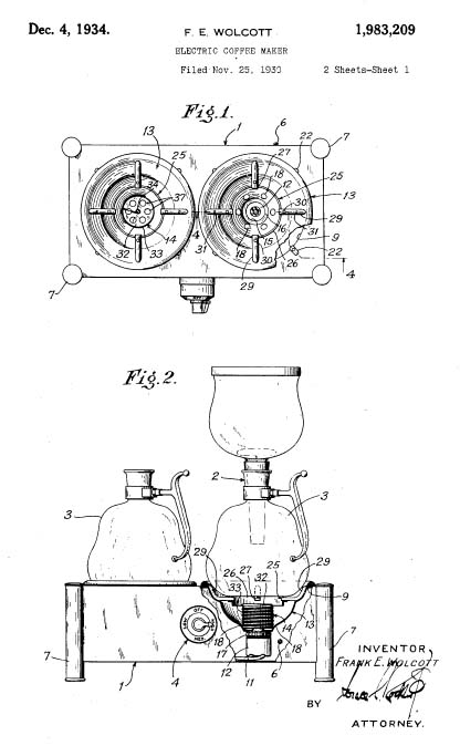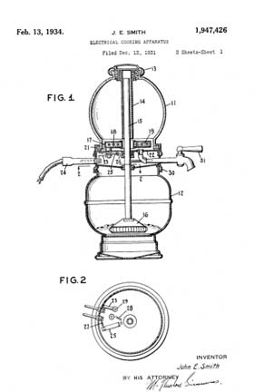 More Details (left)Woolcott's Patent 1,983,210 for the Stove (right) Closeup of the Server Click to Enlarge Click Here to learn how to get free Patent Drawings This variant uses a cheesecloth filter that is kept in place by a spring. Like all appliances of the time, the cord was detachable. This version uses a cord with a resistance device (the ANYHEET control) in the cord to regulate the heat applied to the water. Since many remote communities only had Direct Current (DC), the manufacturer's nameplate makes it quite clear that only Alternating Current (AC) is to be used.