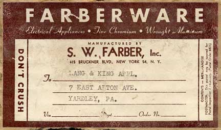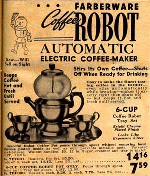 Original Ad for the Complete Robot I only have the bottom...sigh.. Here is the Manufacturer's information: S. W. Farber Company Brooklyn, New York Model 610 Here is a very lovely Farber Coffee Robot Model 511 with an accompanying Tray, Sugar and Creamer. The exterior was designed by Simon Farber of Brooklyn, New York. However, he relied heavily on both Ms. Pierce and John E. Smith (of Belleville, Illinois) for the "automatic" shut-off feature.