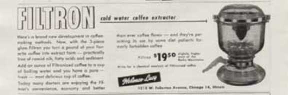 This photo was sent in by the noted 40s Phil of central Indiana. Phil writes: "Here's how you made instant coffee in the old days if you didn't care for Instant-Postum. It's the Filtron cold water coffee extractor, it works like this: