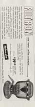 Details of the Filtron Coffee Extractor (left) Closeup of the Filtron Server (middle) Brochure for the Filtron (right) Advertisement for the FiltronBR> Click to Enlarge and Rotate They STILL MAKE THEM!!! They're not as classy as their deco ancestor, but you can have one by writing to: Prince Castle, Inc. 355 East Kehoe Carol Stream, Illinois 60166 Thanks, so much, Phil! Click here to look at another type of collectible, or keep on scrolling for more Coffee devices. | |||||||