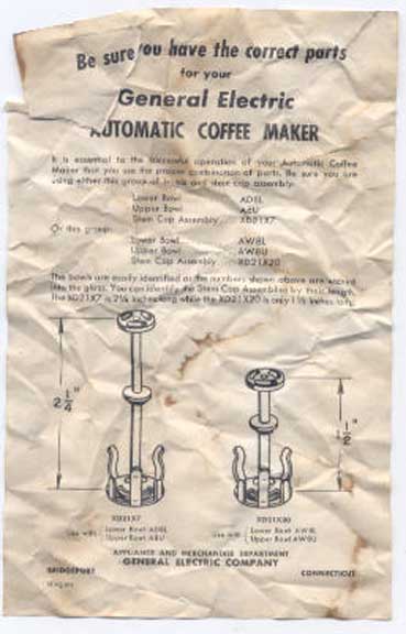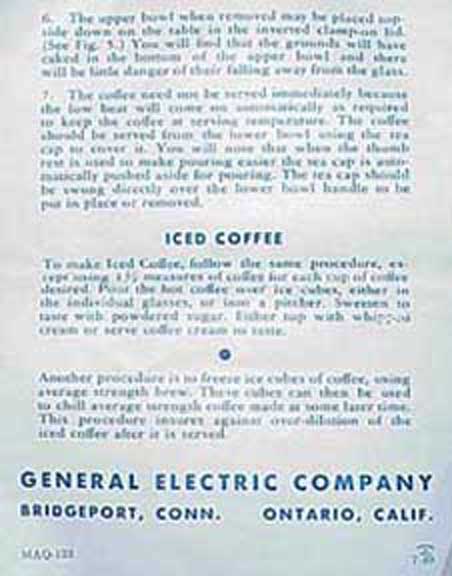 General Electric Model 129P8 Their top of the line coffee maker VACUUM PROCESS Click to Enlarge | |||||||