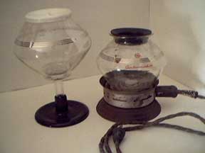 This is a vacuum coffee maker from the 1950s. Surprisingly, not much has changed from the 1920s other than the complications necessary to make the thing fully automatic. Of the vacuum systems, the ones from the 1920s make the best coffee --- if you keep a close eye on it and have ground your coffee specifically for a vacuum maker. At 1000 Watts, this thing uses a whole lot of electricty --- no Conservation was envisioned by the Westinghouse corporation. Their appliances from the 1950s are NOTORIOUSLY inefficient. Here is the Manufacturer's information: Cat No CM-71, 1000W 115 V AC Only Westinghouse Mansfield, Ohio Click here to look at another type of collectible, or keep on scrolling for more Coffee devices. | |||||||