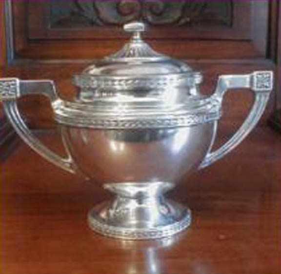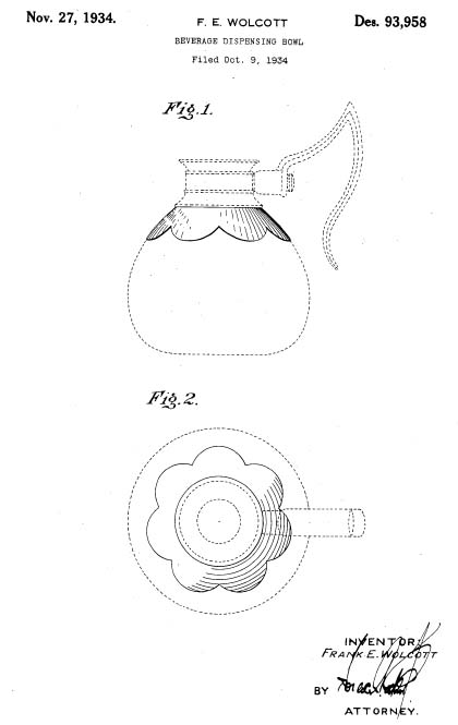 Frank Woolcott's Design Patents D-93,957 and D-93,958 Click to Enlarge Here is a closeup of the cream and sugar bowls as well as the "stove" with the electric heating element