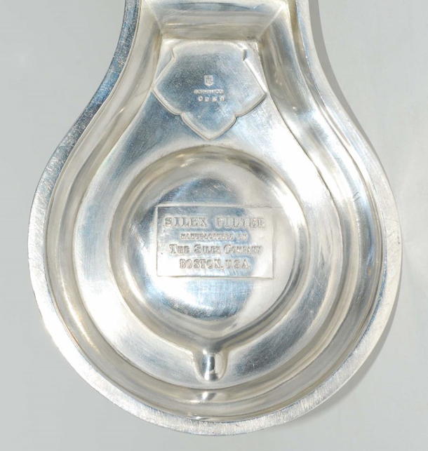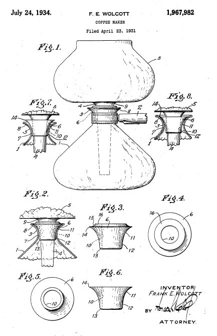 The Filter (left) The Cheesecloth Filter and Metal Cover for the Server (middle) Woolcott's Patent 1,967,982 for the Filter mechanism (right) Anne Boever's improvement on Woolcott's design Click to Enlarge Click Here to learn how to get free Patent Drawings
