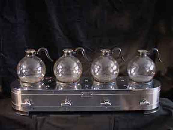 These photos were sent in by our friend Al in New York. Neither Al nor I know very much about this artifact which appears to be a four burner coffe warmer for service in a restaurant. Here's what Al says: "...Could you help me identify this silex coffee maker? It was originally purchased for a coffee shop my grandfather had in lower Manhattan around 1930 and never used. It's a gas four burner made of chrome with four glass coffee pots on top..." This system for brewing coffee was also invented by Frank Woolcott. Here are some additional pictures: