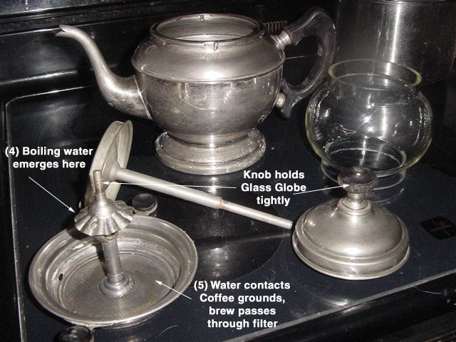 The Silex 8 Cup Coffee Maker (left) Parts (right) Ready to Brew VACUUM METHOD NOT Automatic Click to Enlarge Here is a FOUR cup model