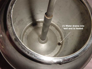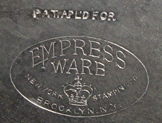 This is a nice (if complicated) percolator that was made in Brooklyn. Here's how it works: FIRST: Water in the server drains into a small well at the bottom. A heat source (e.g. alcohol lamp) is applied to boil the water in the well. The wood handle indicates that this was probably not used on the stovetop. ![]() Inside the Server SECOND: hot water passes through the support tube and is carried upward into the brewing chamber. ![]() The Brew Tube THIRD: hot water emerges and is directed at the coffee grounds by the umbrella-shaped deflector FIFTH: hot water contacts the grounds, creating brewed coffee which drains through the filter back into the server ![]() The Empress Ware Flip Top Parts For reference, here is what the Empress Ware hallmark looks like: ![]() The Empress Ware Hallmark These photos were sent in by our friend Pru, who seems to find al lot of coffee oddities. Thanks, so much, Pru! Click here to look at another type of collectible, or keep on scrolling for more Coffee devices. | |||||||
