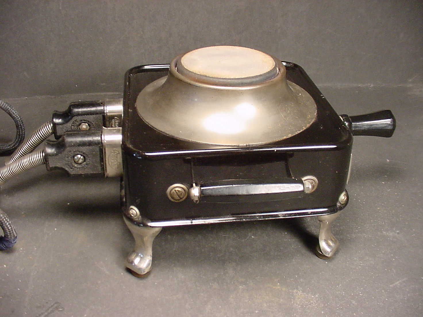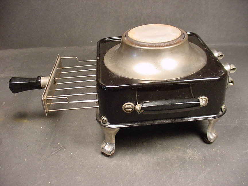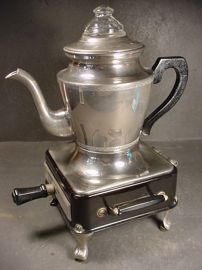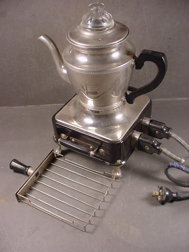 The Armstrong "Perc-O-Toaster"This is a very interesting "hybrid" appliance that was manufactured during the 1920s by the Armstrong Electric Company of Huntignton, West Virginia. The unusual design has the toast elements in a drawer with heating elements on the top and bottom so that no "turning" is necessary. (It makes one slice at a time.) A separate mound-shaped compnent contains heating coils and fits within the bottom of the percolator. These items are quite rare. They were very well made but were rendered obsolete by newer, cheaper multi-slice toasters. Also, the percolator process does not make the best coffee.
