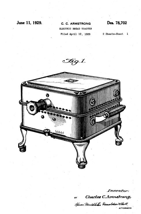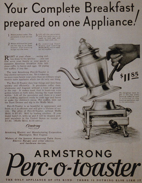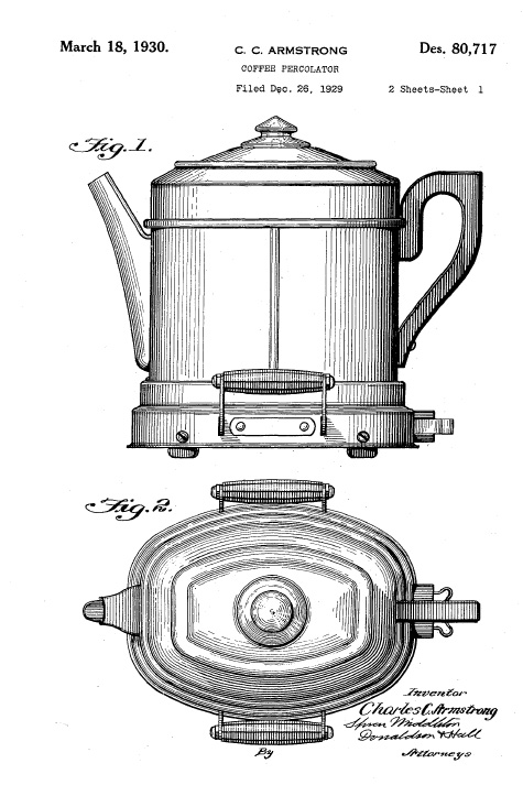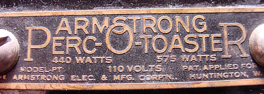 The Armstrong Perc-O-Toaster Ad in the May 1931 Saturday Evening Post Percolator Component Design Patent D-80,717 Toaster Component Design Patent D-78702 Click to Enlarge Click Here to download a complete copy of the Percolator Patent Click Here to download a complete copy of the Toaster Patent If you are contemplating buying one of these, you should be very careful to insist on seeing the original cord and plug -- this uses a noonstandard plug arrangement that cannot be duplicated with new or period cords.
