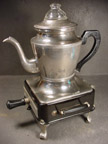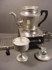 Here is the bottom half of a Farberware Vacuum Coffee Robot, this time disguised as Dutch colonial silverware. I do not own the top half. When I got this, someone had stuck a percolator basket in it. They were probably fed up withthe difficulty of using the vacuum system and tried to do something else with it.