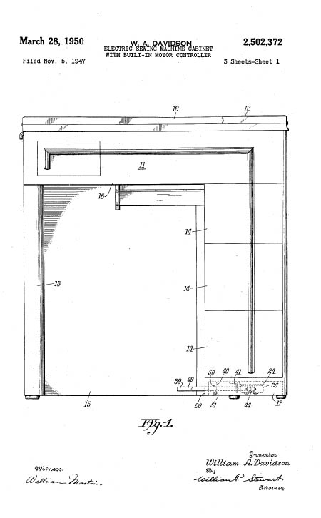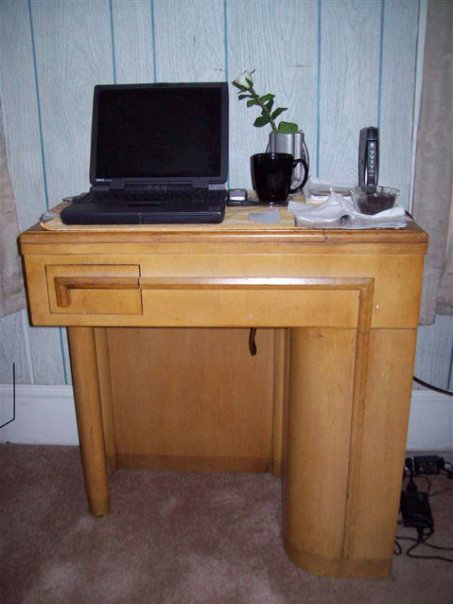 Art Deco Sewing Machine Case M.S. Park Design Patent D - 109,150 W.A. Davidson for the Singer Corporation, Patent No. 2,502,372 Advertisement for the Deco Singer Sewing Machine See our Fans Page for details on the Ribbonaire Fan in the ad Click to Enlarge Click here if you want to learn how to get Free Patent Drawings The case is mahogany veneer with a shellac finish; it showed marks of lots of abuse. Round water stains indicated that leaky flower pots had made their home atop the case, and the finish had been dulled by mildew probably from storage in a damp basement. As you must know by now, all of this is very easily fixed. The shellac was lightly sanded and re-amalgamated by lots of rubbing with alcohol. (Alcohol is the solvent for shellac...) This process removed almost all the scratches and built up a very nice finish. Spar varnish was used to protect the surface The second photo shows the machine ready for use, with the fold-out work surfaces extended. Several clever spring arrangements bring out arms to support the extensions and the machine itself is ingeniously counterweighted. The third photo shows the case with the machine and work surfaces stored. This can double as a very stylish writing or reading desk. In 1995, I restored the EMECO aluminum secretarial chair. I guess that it has been waiting all these years to be paired with the sewing machine... Our Reader's Blonde Deco Singer Sewing Machine Click to Enlarge We want to thank our reader Gunther for sending in this photo. Click here to look at another type of collectible, or keep on scrolling for more Furniture. | |||||||
