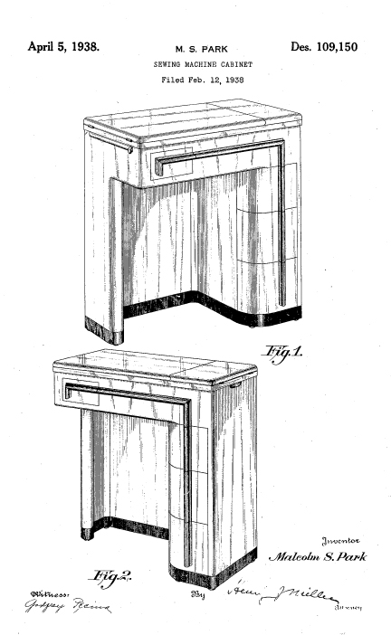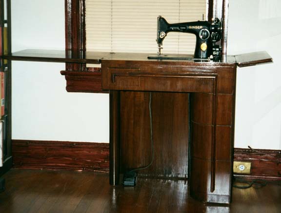 Posted July 25, 2001 Art Deco Sewing Machine CabinetOn a trip to Brunswick, Maryland, we found this Singer sewing machine. The interesting thing is that it has an Art Deco inspired case. I paid $39 for it --- and it included all the Singer accessories, including the Buttonholer and the Curtain Pleater. As is generally the case, the Singer machine still works perfectly. In the 1930s and 1940s, the Singer company made things that lasted forever! This is the only Singer sewing cabinet that was made in the Art deco style. Here is the design patent for this machine