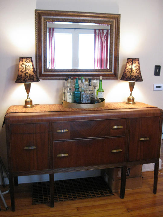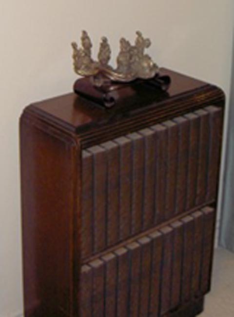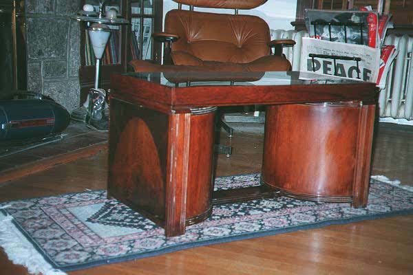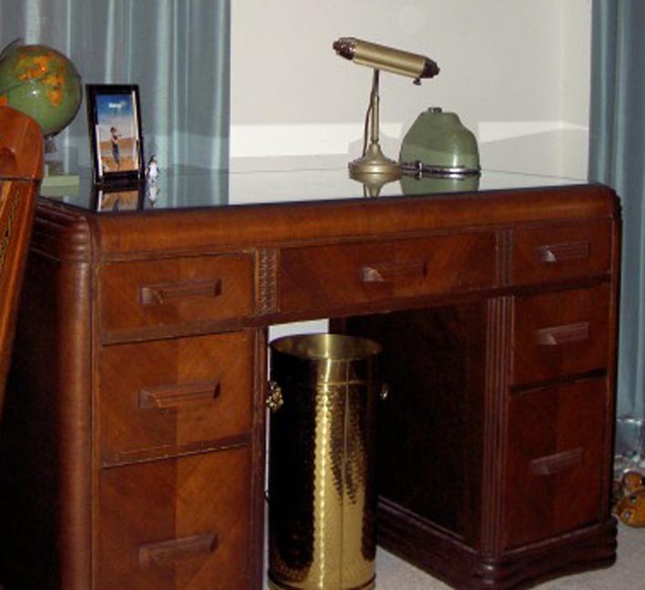 ![]() Dresser, Armoire, and Pier Cabinet Click to enlarge either photo At the Left is Paul's late 1930s waterfall writing desk (finished front and back for different room configurations) Note the matching electric pencil sharpener and globe In the Center is a 1930s Shanghai sunburst chest with two-tone relief. On the right is the 1936 Encyclopaedia Britannica and it's matching streamlined case with two-tone finish.
