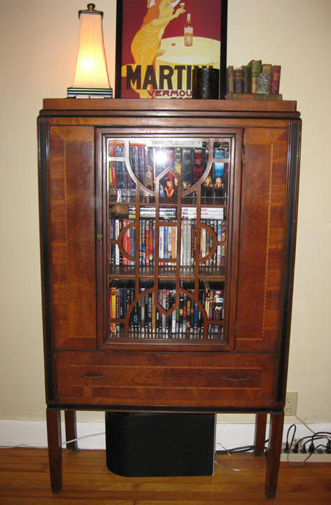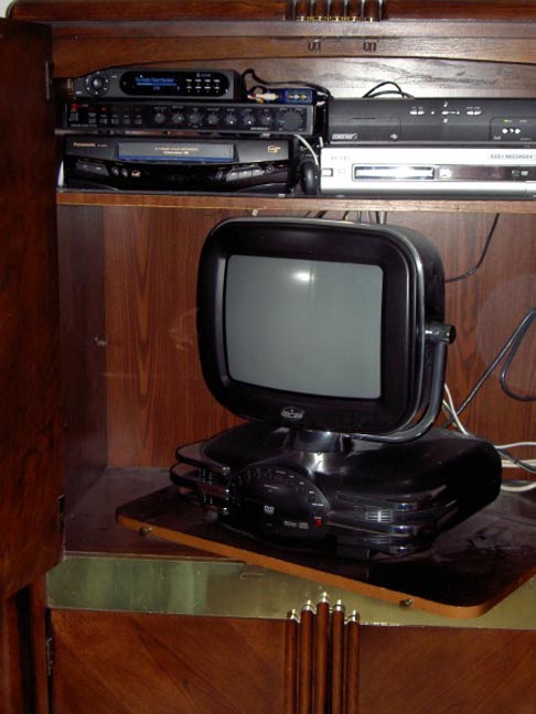 ![]() Clock and Harps Click to enlarge either photo Entertainment was definitely a subject for Waterfall. On the Left is Paul's late 1940s Streamline Moderne Speaker Cabinet along with a mid 1960s speaker and Edcor stereo-to-mono converter. Check out the Rex-Cole Model 5-A (shown on the speaker) in our Vintage Clocks Page. [NOTE: this was made by the same manufacturer as our Etalage-Reclame clock using a Bakelite base.] The interior of the armoire (right) is a bit more modern. Note the Omnifi digital streamer at top left (for picking up 1930s and 1940s internet radio stations).