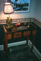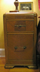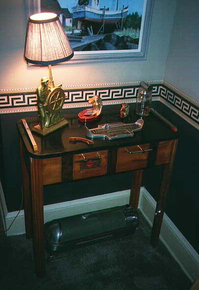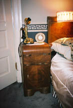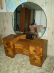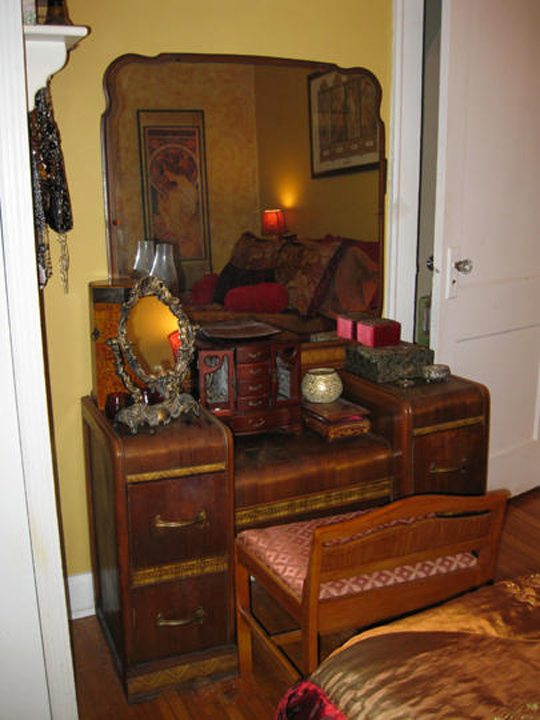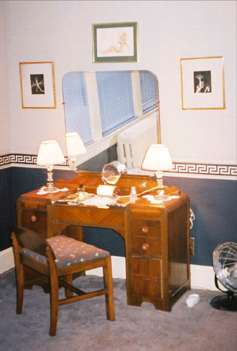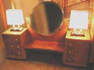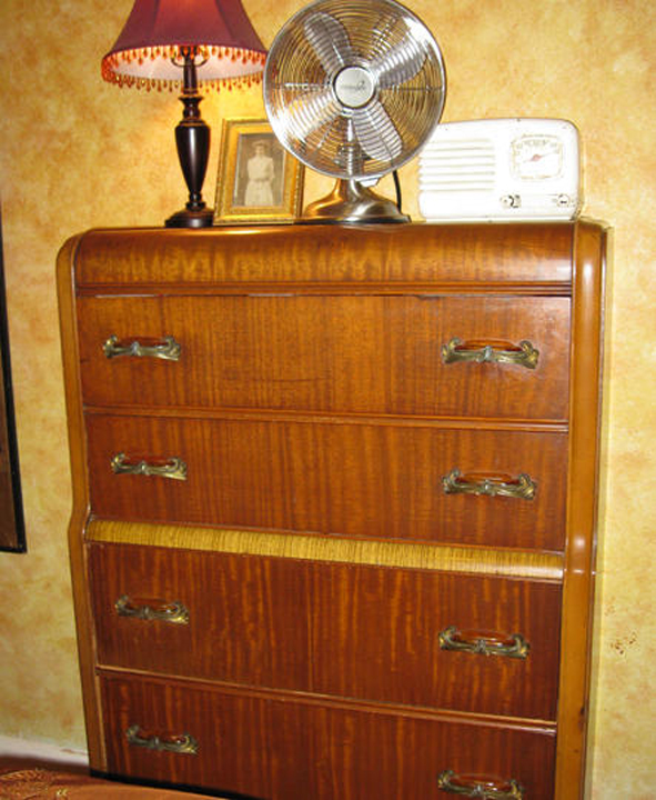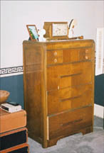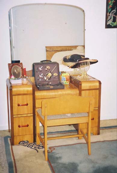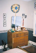 Principal Waterfall Pieces (left) Vanity (middle) Dresser (right) Chest of Drawers Click to Enlarge In the Vanity photo, the flanking photos are X-rays of flowers, very popular in the 1940s. Centered above the mirror is the Vargas Girl from my birth month in the 1940s. The radiant Heater on the floor is on our Fans Page. In the Dresser photo, on left are silhouettes of my family, cut in Cedar Point, Ohio in about 1950. The Fada Radio on the right is on our Radio Page. The silver-framed pictures are of my Mom and Dad, taken in 1943. The sombrero is intended to evoke American interest in Mexico during the 1940s (an inexpensive desitnation for newlyweds). The "tie" is just that - a 1940s cravat mounted to show off my collection of tie bars. The watches (in globes) are on our Clocks and Watches Page. In the Chest of Drawers photo, the Sailor Bank is on our Knicknacks Page. The Perivale Clock is on our Clocks and Watches Page. At the top left, rear of the dresser is a "3-D" photo of Niagara Falls, another popular but inexpensive tourist destination in the 1940s.