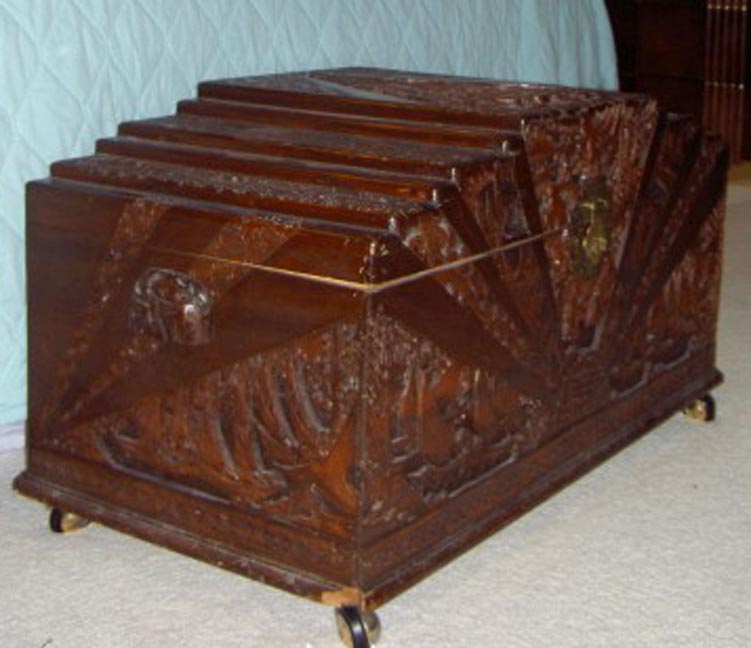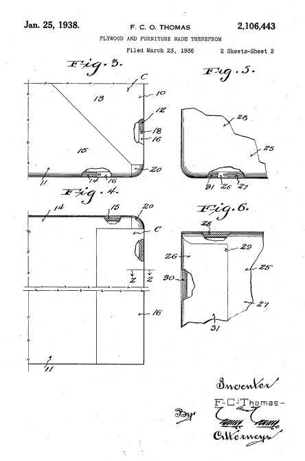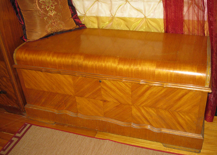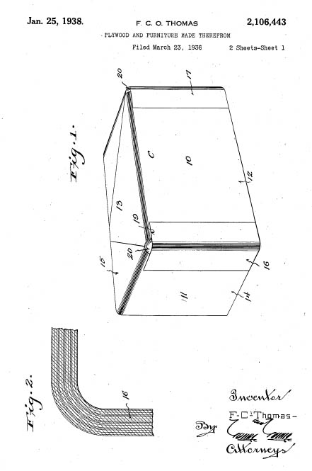 Today, a complete basic bedroom suite goes for $800-$900 in reasonable condition. The hardest pieces to find are nightstands and vanity benches. Cedar chests go for $400 and up. The "value" is sentiment --- on an intrinsic basis, waterfall is not "Fine Furniture" because the construction techniques and materials are generally skimpy. Some labels (Cavalier, Heywood-Wakefield) are exceptions because they used excellent materials. Technical advances made it possible to mass-produce "waterfall" furniture by adapting the "new" -- for the time -- material plywood. Before plywood was available, curves in wood could only be achieved by laborious and expensive means that were not at all suitable to the assembly line. However, technology embodied in the following patents made it possible to create a large number of attractive pieces at low cost.