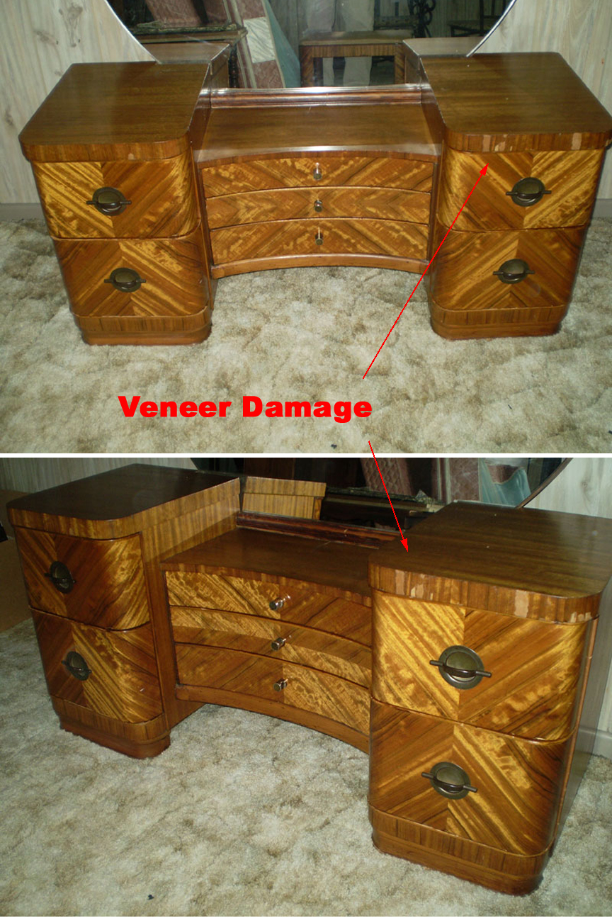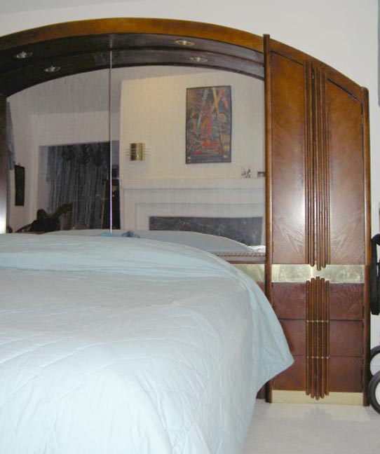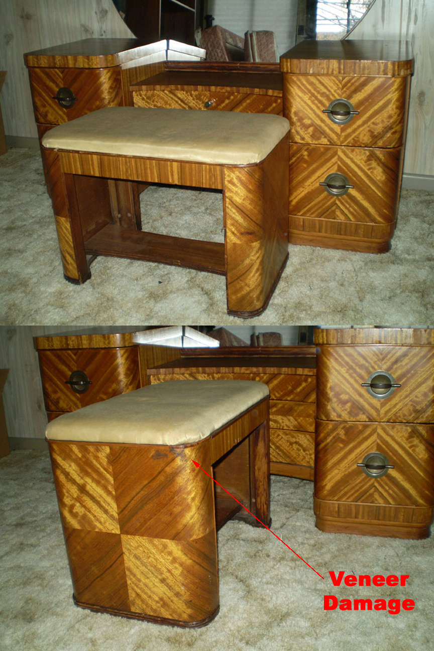 Karen's Waterfall Vanity Click to Enlarge This is a very nice waterfall vanity, probably from the mid 1930s. The bookmatch veneer took a lot of skilled labor. Without a close inspection, I can't tell if the exterior is wood veneer or cleverly printed paper. Some manufacturers used this shortcut -- and almost all Philco radios of the 1930s have a paper exterior rather than wood veneer. Paper or wood, there is some damage -- nothing, however that appears to be irreparable. The drawer pulls have a nice design and really add to the piece. It is VERY HARD to find the matching vanity bench, something that would be a real plus for this set. Or reader Paul sent us some very nice photos of Waterfall and Waterfall-inspired furniture (he has a marvelous collection!): This is a Mid 1980s Bassett waterfall-inspired bedroom set. Note bookmatched chevrons on door veneer and the Pier Cabinet