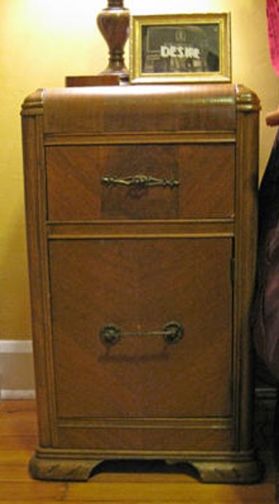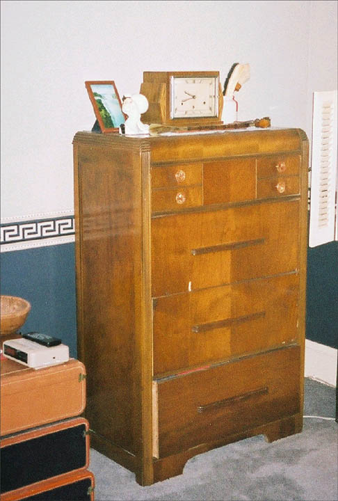 Leslie's Waterfall Furniture Click to Enlarge Here is a waterfall chest that was found by our reader Diane. She writes: "... Do you believe I got this piece from the Salvation Army for only $99? All I had to do was clean it and polish, and just look? I also got the dresser with a round mirror...." ![]() Diane's Waterfall Find We think that Diane got a very good deal! Our reader Karen recently sent us photos of a waterfall vanity. She writes: "... A friend of mine moved suddenly to Hawaii and left this vanity for me to sell. I understand you don't give appraisals but can you tell me a little about this? She said it was made in 1932. She had moved it all across the country and back so finally the original mirror broke. She replaced it as best she could ..."