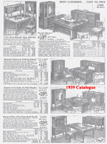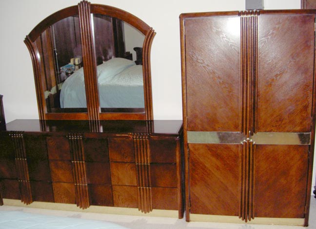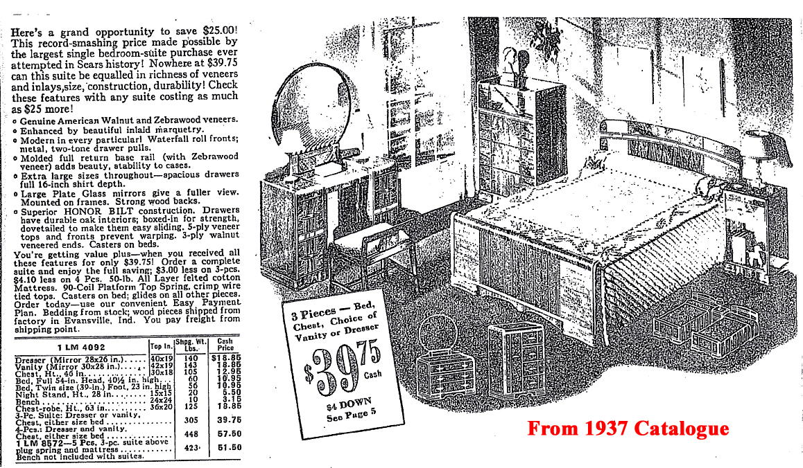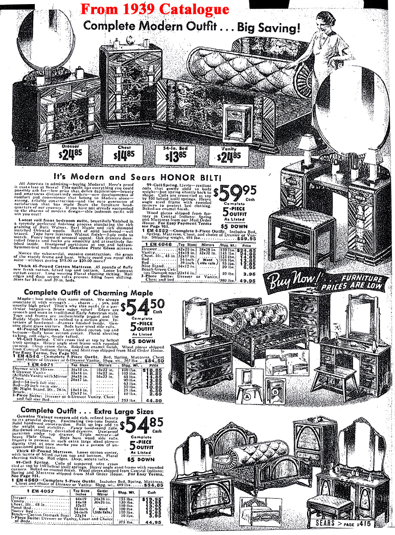 Modern is Acceptable Outside the Bedroom in 1939! (top row): 1930 and 1936 (bottom row) 1937 and two pages from 1939 Click to Enlarge The intended market was newlyweds --- during the depression, most new couples could not afford their own house; the best they could do was a room in their parents' house. Hence, the "Bedroom Suite" was probably the only thing that they owned, resulting in inordinate sentimental attachment to the furniture and a reluctance to change even though finances improved. Many couples have kept and preserved their waterfall sets until the very end. As a result many examples of the waterfall genre are available. The Basic set included a bed, vanity and bench, and chest of drawers. Other items included nightstands, dresser, cedar chest and armoire/chifferobe.