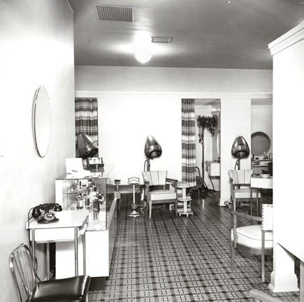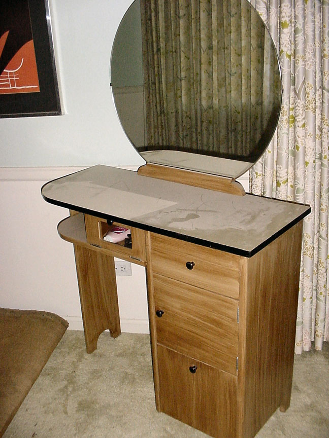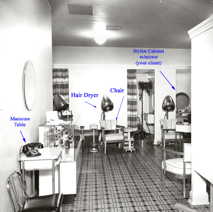![]() Modecraft Manicurist Table and Stool Click to enlarge.. Our friend "Acme Ron" sent us this photo of his mother's beauty shop in Phoenix, taken in the mid 1940s. Click on the photo to see where the various individual pieces would have been located. Thanks, Ron! ![]() A Beauty Shop in the 1940s Click to enlarge and see the position of various items.. Here is the Hair Stylist's Station, seen in the back right of the photo (enlarge it to see the station pointed out). Ron kept this and (aside from some dust) it seems to be in very good condition!  '