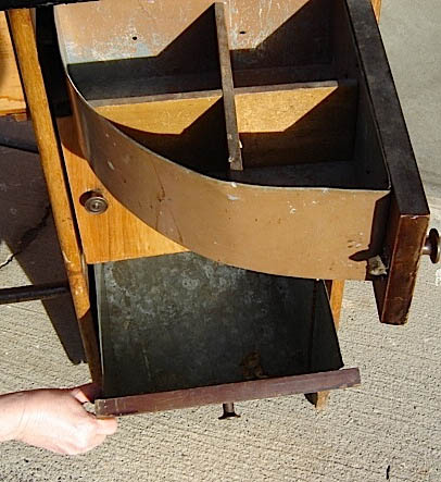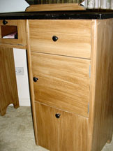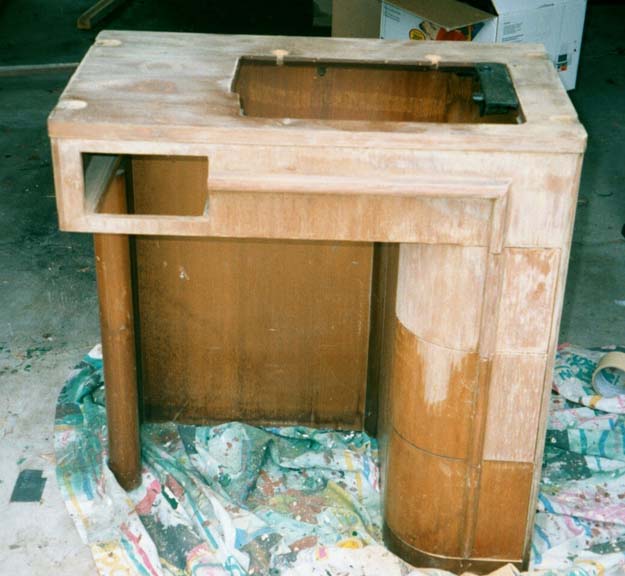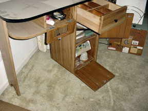 Singer Sewing Machine in Art Deco Cabinet (left) During Restoration (middle) Open, Showing Machine (right) Closed Click to Enlarge | |||||||