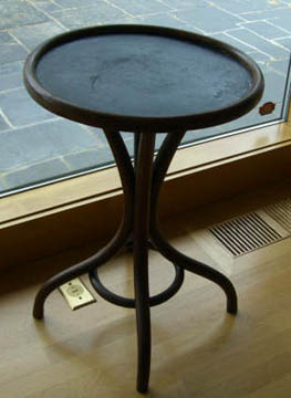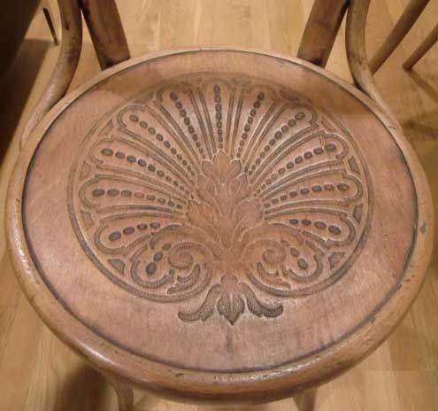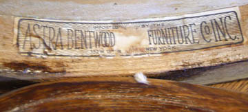 This is a Thonet Bentwood chair made in Czechoslovakia and imported by the Astra Bentwood Company. This is the bottom of the line for bentwood chairs. I got five of these for $5 from a bookie in Pittsburgh in 1966. He said "Take as many as you want --- we keep 'em here in case we get raided --- it's nobody's loss" Check out real Astra Bentwoods on e-bay today... The wood is beech that has been steam-bent. The finish is a mixture of lampblack and milk, and it wears to a wonderful aubergne color. Click Here to learn more about Thonet Bentwood Furniture. Our friend Richard had a similar experience in buying Thonet/Astra bentwood chairs, but the seller was diametrically opposite -- it was the First Presbyterian Church of San Luis Obispo (CA). ![]() These Chairs Answer to a Higher Calling ![]() The Astra Bentwood Label Richard writes: "... These chairs were purchased in the early 1960's. Price $5.00 each. They were Imported by Astra Bentwood Furniture Co., New York. Some of the chairs have the Fischel Tchescoslou stamps on the chairs ..." The "Czechoslovak State" was an early name for Czechoslovakia, probably during the 1920s. Czechoslovakia was founded in October 1918 as one of the successor states of Austria-Hungary at the end of World War I. It consisted of the present-day territories of the Czech Republic, Slovakia and Carpathian Ruthenia. Its territory included some of the most industrialized regions of the former Austria-Hungary and is a logical origin for mass-produced furniture. ![]() The Woodburned (Brand) of the Fischel Company ![]() The Fischel Bentwood Label The company was founded by David Gabriel Fischel one month after the “patent” granted to Thonet expired. Fischel, a vegetable oil salesman from Prague, opened his business on June 10 1871 and placed it in the hands of his eldest son Alexander Fischel who had worked for Thonet for many years at their Koritschan factory. At Niemes, a smalltown in the most industrial part of the Danube region, the Fischel factory employed 100 workers and produced 100 units per day. According to the Thonet Website, the label on Richard's chairs dates to the 1920s. ![]() ![]() Richard's Thonet Table ![]() The Thonet Woodburned Brand Richard also has this to say about his lovely Thonet table: "... We purchased the table in McMinnville, Oregon $75.00 great price. (ed: NO Kidding!!) It has the Thonet stamp on one of the legs. It is 27 inch high and 18 1/4 inch dia. ..." Click here to look at another type of collectible, or keep on scrolling for more Furniture. J and J Kohn Bentwood ChairsJ&J Kohn were among the first mass marketers of bentwood chairs. "Semper Sursum" means [literally] "Always Upward" or [figuratively] "Aim High" The Kohns made furniture in Austria (rare), Czechoslovakia (available), and Poland (common). Here is how to tell the difference: