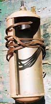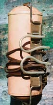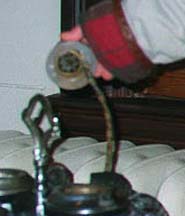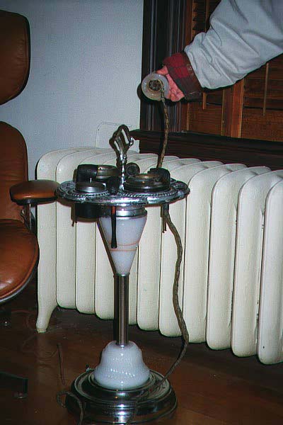 First of all, let us say that we are more-or-less devoted to preserving the 1940s and we DO NOT ADVOCATE SMOKING. This item is definitely not Politically Correct today, although something like this was a fixture in almost every American household during the 1940s. Alas, it has no use except as a smoking stand. We certainly understand that some of our readers may be concerned, but we got this as a sociological curiosity. The base is made of stainless steel with unusual globes of opalescent milk glass. The top is cast aluminum and is decorated with Western themes -- a six-gun, a covered wagon, a stage coach and horses. The accessories include two ash trays, a cigarette holder, and a cigar/cigarette lighter. There are receptacles to hold four pipes, as shown. The base is lighted and emits a soft glow when all the lights are out except for the smoking stand and the dial of the radio. Just the scene for listening to the Lone Ranger on a winter night. This is precisely the type of object that sat beside Dad's Chair, from which Paternal dictates (as in "You'll have to ask Dad about that") were interspersed with reading the paper. In my family, the Smoking Stand is an icon of patriarchy and probably was so in many other families of my generation. Political correctness aside, we felt that such an item was essential to our 1940s restoration. However, the most distinctive part of this stand is the cigar/cigarette lighter. My partner's hand is holding it up in the photo. This is a milk glass piece that contains a nichrome wire resistance unit, much like the element in a toaster. A clever gravity switch that has a steel ball bearing keeps the lighter "off" when it rests in the stand. When you pick it up and tilt it toward your cigarette or cigar, the steel bearing rolls backwards, completes a circuit and the element glows red- hot. Believe me, this is a DANGEROUS item. The complete lighter assembly is a real rarity because when children came into the house, the first thing that went was the cigarette lighter. I can remember that the thing used to fascinate me when I was a kid. Then it disappeared. Even my Father's Absolute Power could not stand up to my Mother's hatred of the Cigarette Lighter. Don't ever mess with Mom... We got this letter from our reader David: "... I have a smoking stand almost identical to the one pictured on your page. The lighter on mine however went the way of my older brothers and or sisters, as you mentioned in your article. This was purchased for my grandfather for his 50th birthday in 1953. I need to rebuild the guts in the lighter. I was wondering if you could take a look at your cigarette lighter and describe to me what all is in the guts, I suspect it was a coil like you would find on a old space heater. If you have a digital camera, a photo would be great. If not please don't bother. Any help you could give would be greatly appreciated..." As promised, here is a photo of the "insides" of the cigarette lighter: