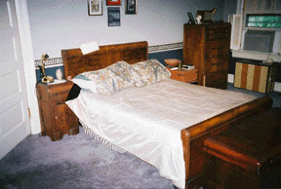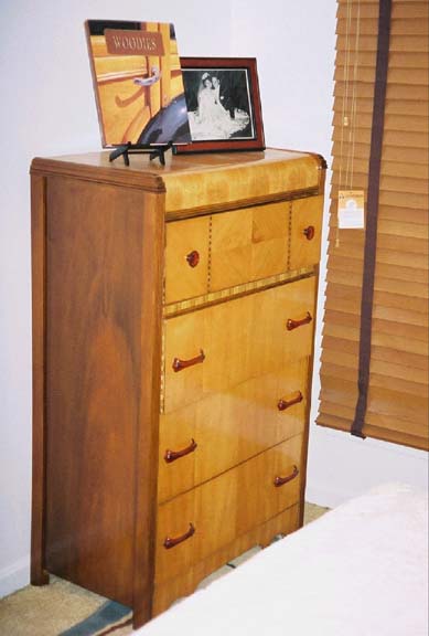 Technology for Bending Plywood into Curves Waterfall Technology Patent No. 2,106,443 Click to Enlarge Click Here to learn how to get FREE Patent Drawings The plywood is covered with veneer or paper-thin slices of real wood, giving the illusion that the piece is made of a more expensive wood, such as mahogany or oak. Veneer has a number of enemies, most significantly moisture that causes the veneer to detach itself from the underlying plywood substrate. The most common veneer damage results from storing the furniture in a humid or damp basement. The veneer loosens at the base of the object and often peels away in a manner resembling "fringe". Heat, particularly cigarette burns can be a problem. If the glue gets too hot it will swell causing bubbles to form. Cigarettes, matches, or other hot objects (i.e. curling irons) can actually destroy the veneer. Our webpage on Restoration of a Radiobar has a number of photos illustrating veneer repair. The finish is most often mahogany stain and spray shellac with very rare exceptions such as our blonde set shown below. Alcohol is the solvent for both shellac and perfume. Many times, the surface of the vanity is heavily pitted where perfume has been spilled. Our web page on Cavalier Cdar Chests describes several techniques for restoring and reinvigorating the shellac finish. The BIG NO-NO is "Do NOT under ANY CIRCUMSTANCES use paint stripper on a waterfall piece." First, alkaline solutions are NOT the solvent for shellac and Second, the stripper will loosen the glue and the veneer will come off. So, avoid paint strippers. This is our Waterfall bedroom set. It probably dates from the late 1930s. We are very lucky to have almost all the pieces associated with a set like this -- vanity, dresser, chest of drawers, bed, two nightstands, cedar chest, chair and vanity bench. We do not have an armoire or chifferobe, but we wouln't have a place for it anyway. Some of the pieces are mixed in from other sets (like the Nightstands and the cedar chest), but the feel of the room is much like you might expect for a couple starting out their life. This furniture was very cheap, although the use of veneer effects like bookmatching makes the pieces very attractive. Waterfall has a warmth about it that is not captured by very high end furniture. This stuff will always have a very high emotional value and will remain collectible in the future. It is VERY easy to live with!