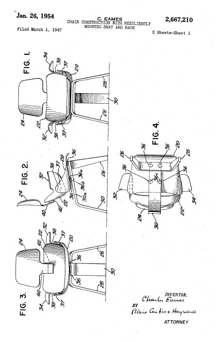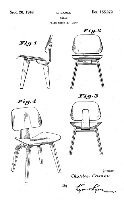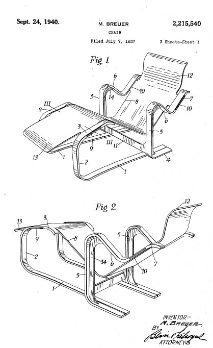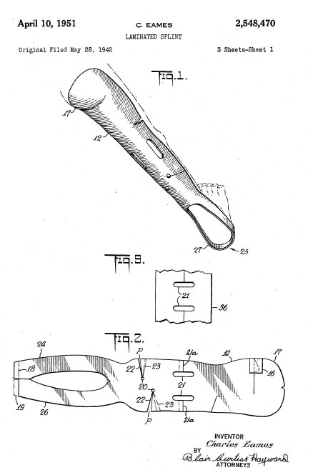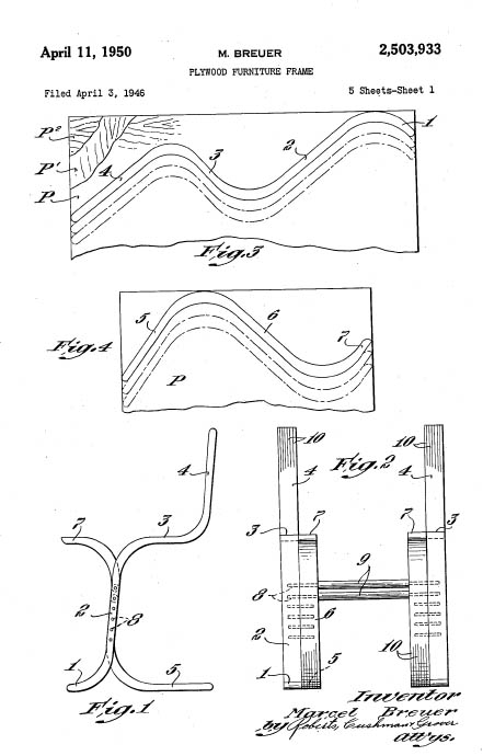 Eames Molded Plywood Patents (left) Molded Plywood Leg Splint Patent No 2,548,470 (middle, right) Eames Potato Chip Chair, Design Patent D-155,272 and Technical Patent No 2,667,210 Click to Enlarge By the way,at the same time, Marcel Breuer was also experimenting with molded plywood, as shown in these patent diagrams: