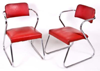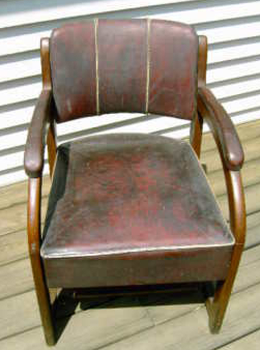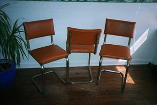 My partner and I ventured up to Chambersburg. I had warned her that the workshop was filled to overflowing and that we were NOT going to come back with any restoration projects. As we approached our very first thrift store, this resolve dissipated like a light fog. We didn't even have to go into the store. On the sidewalk in front of the store were three forlorn kitchen chairs tied together with string bearing a hand-lettered card that read "All three for $1". My partner calls me the "patron saint of chairs" because I have this thing for restoring chairs. Usually, these things are junk, but I made a cursory examination and found that we had struck gold. But first some background. In the 1920s, Marcel Breuer made history. He had a philosophy of reducing things to their bare minimum. As part of this, he created an art object --- the bare essence of "chair". He started with electrical conduit, essentially a thin tubing that can be bent in any direction. He formed a three dimensional "S" shape and fashioned a seat and back out of a peach crate. Although it was done as an intellectual exercise, the darn thing was very comfortable. Thus, Breuer had unwittingly invented the Kitchen Chair of the 1950s. One of his original chairs is in the Baltimore Museum of Art and is worth a zillion dollars No, the three forlorn chairs are NOT Breuer chairs. They are, however Douglas Kitchen Master chairs. My father was in the kitchen business for years and for many of those, I was dragged along, so I have intimate knowledge of kitchens of the 1950s. Dad always specified Douglas Kitchen Master chairs because they were made with real chrome tubing --- they would not rust, dent, or in any other way deteriorate. And, when I did some cursory rubbing onthe forlorn chairs in Chambersburg, layers of dirt, paint and grease came off easily to reveal the chrome below. The Douglas "Kitchen-Master" chairs were immortalized by Norman Rockwell in his October 30, 1948 cover for The Saturday Evening Post, as shown below The October 30, 1948 cover of The Saturday Evening Post Click Here to read about the Sunbeam T-9 Toaster Click Here to read about the Silex Vacuum Coffee maker The next part of the saga moves to TEDCO, an upholstery supply store in Baltimore. This place is an upholsterer's dream --- not only do they stock everything at bargain prices, but they also have Specials. The day we visited them, they were having a special on REAL LEATHER seconds at $5 a yard. This is like getting steak at 10 cents a pound. Since we were upholstering kitchen chairs, it didn't really matter if a hide had holes in it or splotches, because we didn't need very big pieces. They also had a nice special on high quality foam, so we walked out with enough material to do the job for $17 Although leather is very hard to work with, the results more than justify our $1 investment! Click here to look at another type of collectible, or keep on scrolling for more Furniture. | |||||||