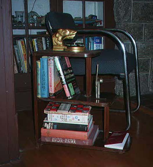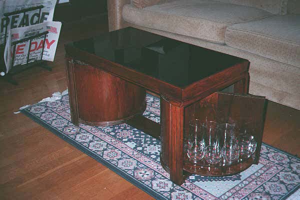 Bulk Trash Day is a big event in our house. We hit the jackpot in this little Art Deco Martini Bar. Someone had tossed the thing out, possibly because it had broken in two and had no mirror top... With considerable effort, we were able to repair and refinish the Bar. We are indebted to the folks at Read Plastics in Rockville who custom cut a piece of 1/2inch black lucite to make our table top. In the background, you can see some of our other "found" treasures, including a streamlined vacuum cleaner, a western-theme lighted floor ashtray, an Eames Chair (YES! Someone in Chevy Chase actually tossed out a REAL Eames chair AND the ottoman!), and part of our collection of vintage newspapers. The beautifully veneered ends swing open to reveal the glassware and equipment necessary to make the perfect Martini. The only fly in this ointment is that we don't drink... But, we have a souvenir from the period when the Martini was all the rage. Click here to look at another type of collectible, or keep on scrolling for more Furniture. | |||||||