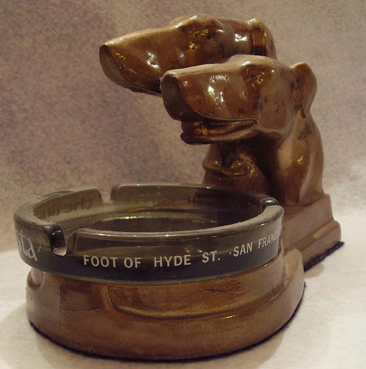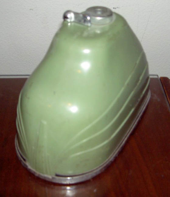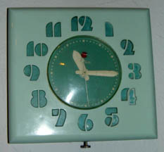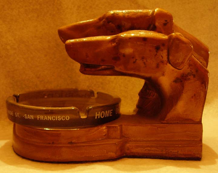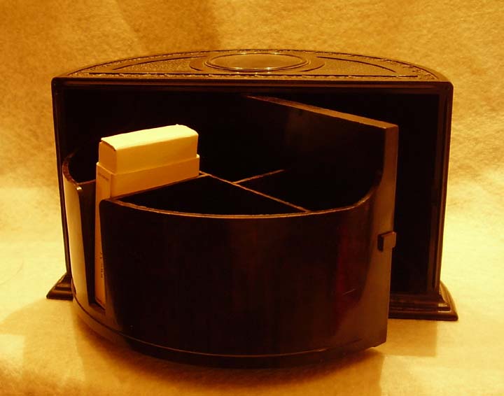 FrankArt Racing Greyhounds Ash Tray Click to Enlarge The photo also shows some of our other treasures. On the little bookshelf is a FrankArt Ashtray featuring two racing greyhounds, and a bookend called "Scaredy Cat" from the 1946 Chase Art Metal catalogue (shown in detail on our Knicknacks Page. We just acquired a bakelite cigarette box that operates in the same fashion as the martini bar. Bakelite Cigarette Box Click to Enlarge Click here to look at another type of collectible, or keep on scrolling for more Furniture. | |||||||