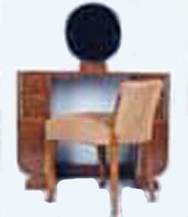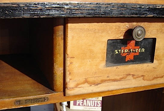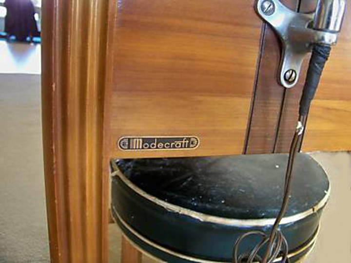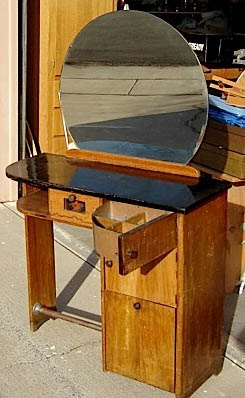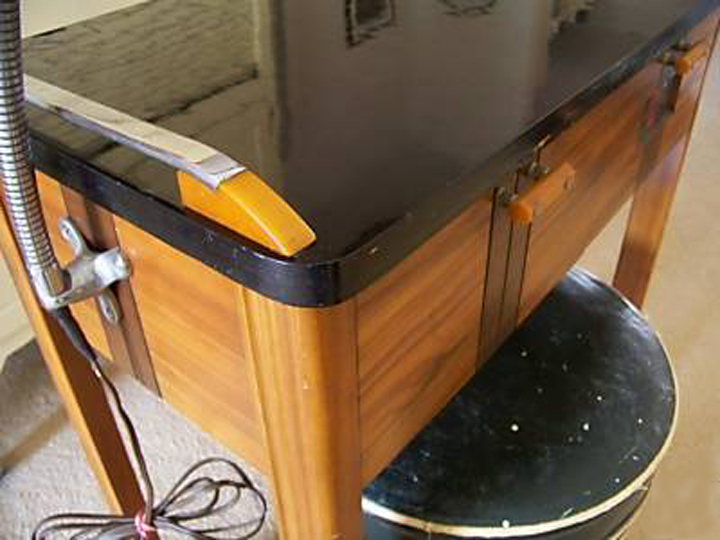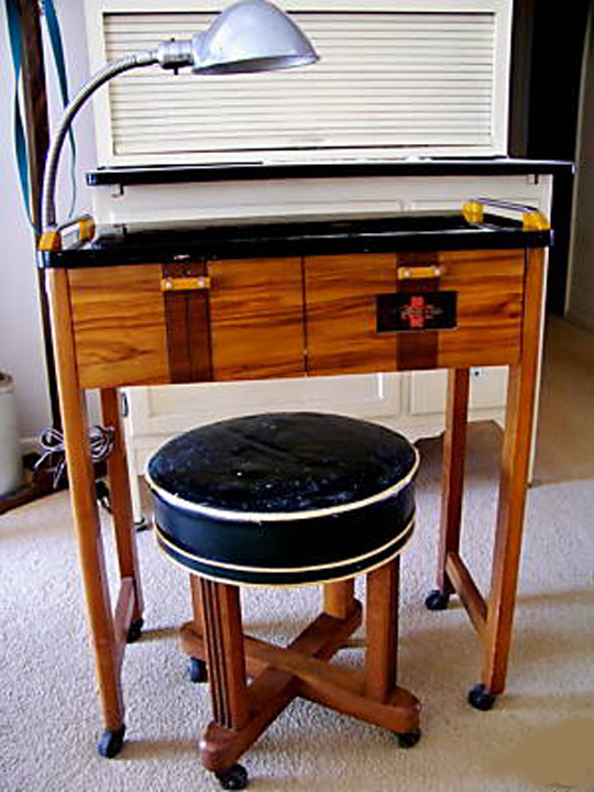 Another Lucky Find: In July, 1999 I was having my car serviced at the Sunoco on Connecticut Avenue near what used to be Chevy Chase Lake (approx. Connecticut and Jones Mill Rd). During the 1920s, the Connecticut Avenue trolley line ended here and the Chevy Chase Land Company built a recreational facility on a "lake" made by damming up Rock Creek. So, people would take the trolley to come swimming in the far rural outreaches of the city... Boy have things changed! OK, while the car was being serviced, I dropped into the Crestar (...now Sun Trust...) Bank branch to use the ATM. This particular building is a survivor of the old Perpetual Savings and Loan, the ONLY financial institution in DC that did not shut down in the Banking Crisis of 1932. (Perpetual, however, did succumb to the Thrift Scandal of the early 1980s.) On the other hand, they left behind this building, a masterpiece of 1950s international style architecture. If you like this period, you should pay a visit before the number crunchers turn this into a Starbucks. This harkens back to a time when you might actually think of getting dressed up to go to the bank. Boy, that really was 50 years ago... Nowadays, you have to think about washing your hands after you go into most banks. After paying attention to the murals, carpets, lighting and Scandinavian wood furniture, I made my way back to the Sunoco station. On the way, I noted a small table on the street, looking very much like a candidate for bulk trash day. I spent some time finding a worker who spoke English, but eventually determined that the object was, indeed slated for disposal. I picked the thing up and carried it back to the car. I have NO idea how this got into a bank, but it is an actual Modecraft manicurist's table. The black top is an early laminate, and the aluminum handgrips on the top are set in Bakelite. The handles on the two drawers were originally Bakelite, but I was only able to find one of them, and so more contemporary brass and chrome handles have been substituted. One of the two drawers has a glass front with a red cross and the word "Sterilizer". (This is just a drawer and shows no sign of ever having been anything else.) here's the Design patent Drawing or this table. ![]() Design Patent D-110,401 for the Mode Craft Manicurist Table Click to enlarge.. The August issue of Washingtonian Magazine (page 119) shows a picture of a large beauty salon in the 1940s and (mirable dictu) there is an identical Modecraft manicurist table... Here are some other photos of Modecraft (also spelled "Mode-Craft") salon furniture.  '