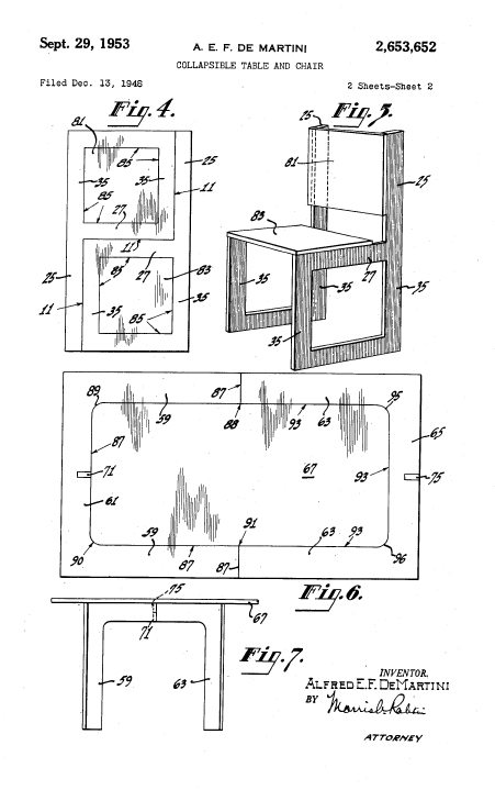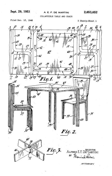 These photos were sent to us by our friend Dave in Las Vegas ![]() ...I ran across a great plywood laminated chair in a garage sale about 15 years ago. It was a chair that was purposely made in about 6 pieces and went together with small round wood dowels...so it could be set up and taken down. It is quite large and to me appears as though it came from the early Art Moderne era. The actual wood dowels are missing and I have only set the chair up about 3 times in all these years because it takes me about that long to figure out how each piece interlocks with the other.You will love this....the garage sale was in a very expensive area of town and when I askled how much for the monster chair..the lady laughed and said she had been literally trying to bribe people to get it out of her garage all morning...So I told her I would give her $5 and she could be rid of it..She very happily said "TAKE IT AWAY"...Last year my wife and I decided to move from Minneapolis to Las Vegas, my wife asked if we had to take the monster since we were getting rid of almost 30 years of collecting and saving...I said we were definitely bringing it with us & we did... During our preparations to move, I set it up in our driveway during a moving garage sale we had (marked not for sale) just to see if anyone out there appreciated this type of furniture....I had one individual that literally begged to buy the chair.... Click Here to see more of Dave's Chair. MAKE YOUR OWN JIGSAW FURNITUREHere is a patent diagram of a concept developed by Alfred DeMartini in 1953. It shows how you can manufacture a table and two chairs out of one sheet of plywood!