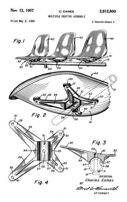 Breuer Molded Plywood Patents (left) Molded Plywood Chair Patent No. 2,503,933 (right) Molded Plywood Chaise Patent No 2,215,540 Click to Enlarge For the Eames, one thing always seemed to lead to another. Their revolutionary work in molded plywood led to their breakthrough work in molded fiberglass seating, as illustrated below: