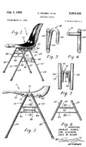 Eames Molded Fiberglass Patents (left) Molded Fiberglass Nesting Chair Design Patent No. 2,893,469 (middle, right) Molded Fiberglass Multiple Chair Patent No 2,812,800 Click to Enlarge A magazine contest led to their highly innovative "Case Study" house. Their love of photography led to film making, including a huge seven-screen presentation at the Moscow World's Fair in 1959, in a dome designed by their friend and colleague, Buckminster Fuller. Graphic design led to showroom design, toy collecting to toy inventing. And a wooden plank contraption, rigged up by their friend, director Billy Wilder for taking naps, led to their acclaimed chaise design. A design critic once said that this extraordinary couple "just wanted to make the world a better place." That they did. They also made it a lot more interesting. Click here to look at another type of collectible, or keep on scrolling for more Furniture. | |||||||