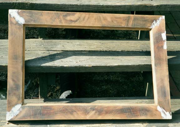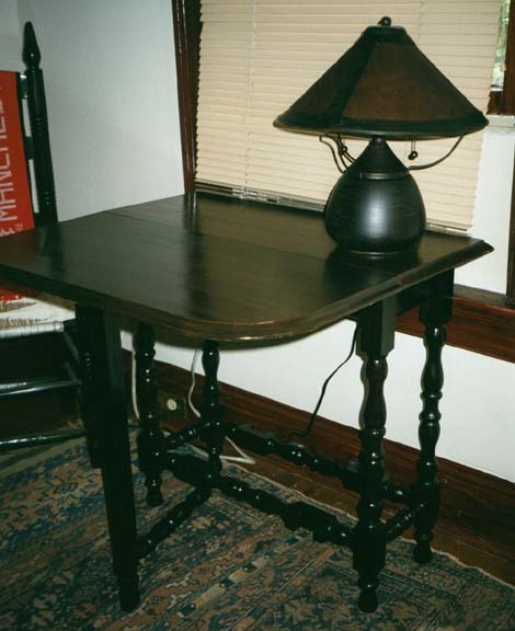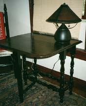 Posted July 25, 2001 Gate Leg TableThis is a vey nice dark mahogany gate leg table. As found, there were several problems. First, one of the two leaves was missing as was the actual gate leg. Next, there was an enormous round stain on the center, indicating that a leaky flower pot had probably resided there. On the other hand,the thing was solid mahogany and seemed eminently restorable. Once again, the glue in the joints had deteriorated and the entire structure was quite rickety. Thus, it was necessary to disassemble the table into its component pieces. The center panel and leaf had incurred considerable damage, so they had to be reduced to bare wood. The table frame was in much better shape and needed only a light sanding. Because this was solid mahogany, I opted for a completely "organic" finish. The surfaces were sanded with increasingly finer grits --- 60, 100, 150, 200. A thin coat of shellac was applied. Alternating coats of penetrating stain and shellac were applied to build up a depth of finish. The stain is soluble in mineral spirits while the shellac is soluble in alcohol. This layering process simulates the growth of trees and gives a very rich finish without unduly hiding the grain of the wood. A total of six layers were required to disguise the residue of the flower-pot stain The table was glazed with spar varnish mixed with pigment (Iron Oxide and Van Dyke Brown, in separate coats). Each glazing was allowed to dry for a week and wet-sanded. A final clear coat was applied and buffed with #0000 synthetic steel wool and auto rubbing compound. Yes, the table required about two months of wall time to complete, although each individual work session was only about half an hour. I had to fabricate a Gate leg --- a piece of mahogany from my "remnants" pile was pressed into service, proving that it is valuable to scavenge wood furniture even when it cannot be restored. The last photo shows the table in service in my office. The table now holds a Bean Pot lamp with a mica shade that I picked up at a church thrift store for a few bucks. It required only minor re-wiring. Click here to look at another type of collectible, or keep on scrolling for more Furniture. | |||||||