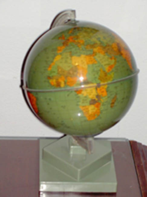 ![]() Desk, Chest and Encyclopedia Click to enlarge any photo The desk accessories are also of interest. Paul says, "The desk 'set' was never sold as such. What's remarkable about it is that there was such a continuity of style and a consenus about what color turquoise was in the 1940s and 1950s..." The pencil sharpener was designed by Robert Fleming and made in 1947 by the Bert M. Morris Company in Los Angeles, CA. (US Patent 2,408,767) The globe was made a bit later in Italy,